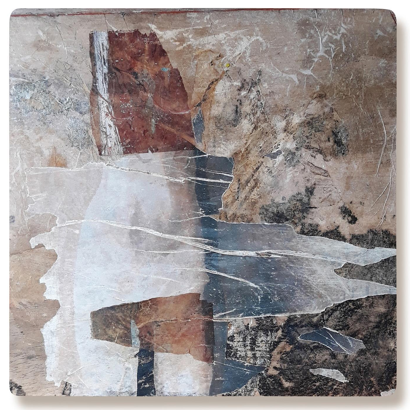 Obra realizada sobre madera con tinta ferrotánica, sulfato de hierro, tanino, pigmentos, lápiz, carboncillo, papel de seda y fijador.