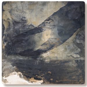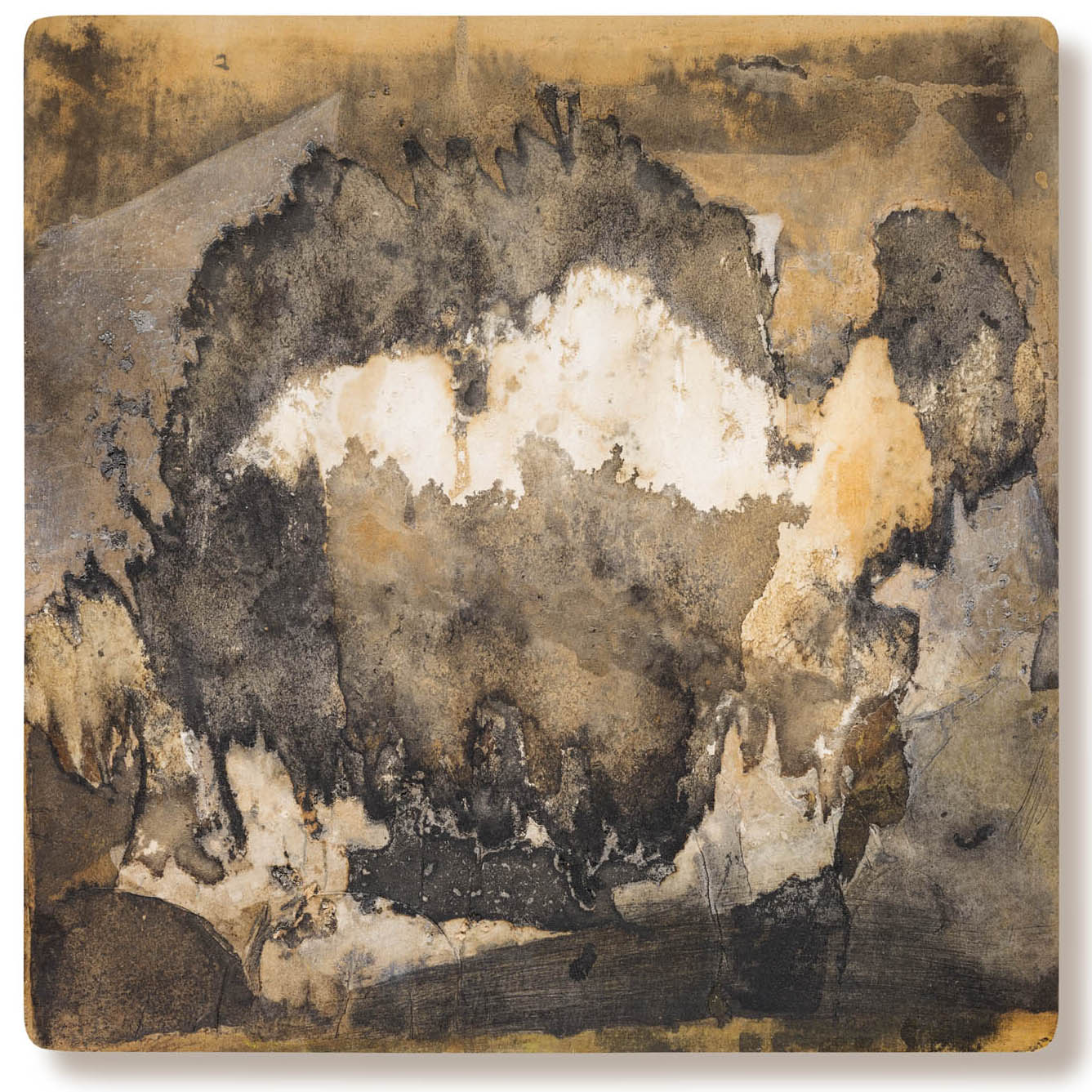 Obra realizada sobre madera con tinta ferrotánica, sulfato de hierro, tanino, pigmentos, lápiz, carboncillo, papel de seda y fijador.Mixed media on wood