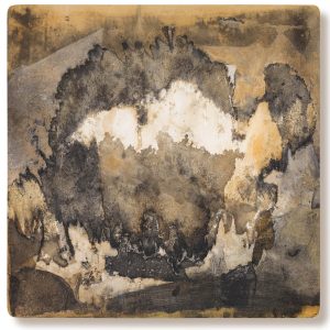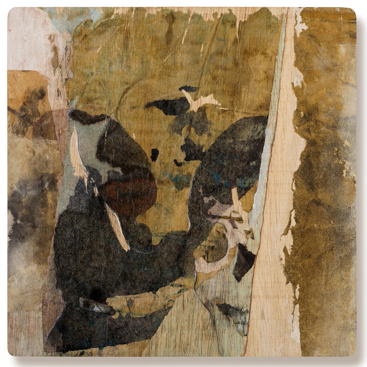 Obra realizada sobre madera con tinta ferrotánica, sulfato de hierro, tanino, pigmentos, lápiz, carboncillo, papel de seda y fijador.